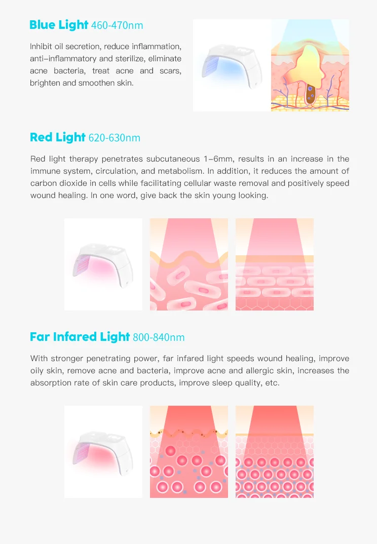 - La luce LED rossa e gli infrarossi lontani stimolano il rinnovamento cellulare e uniformano il colorito.
