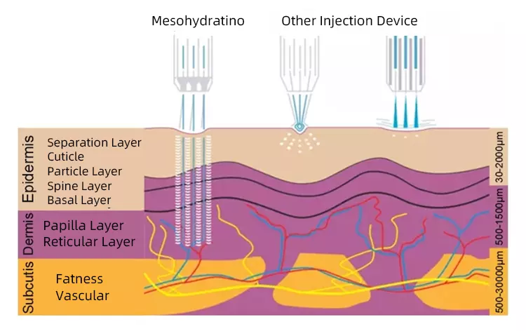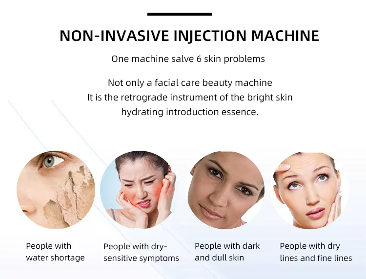 L'apparecchiatura senza aghi utilizza l'aria compressa per atomizzare uniformemente i prodotti a pressione elevata, permettendo loro di penetrare negli strati più profondi della pelle e stimolare il metabolismo. Questo processo: