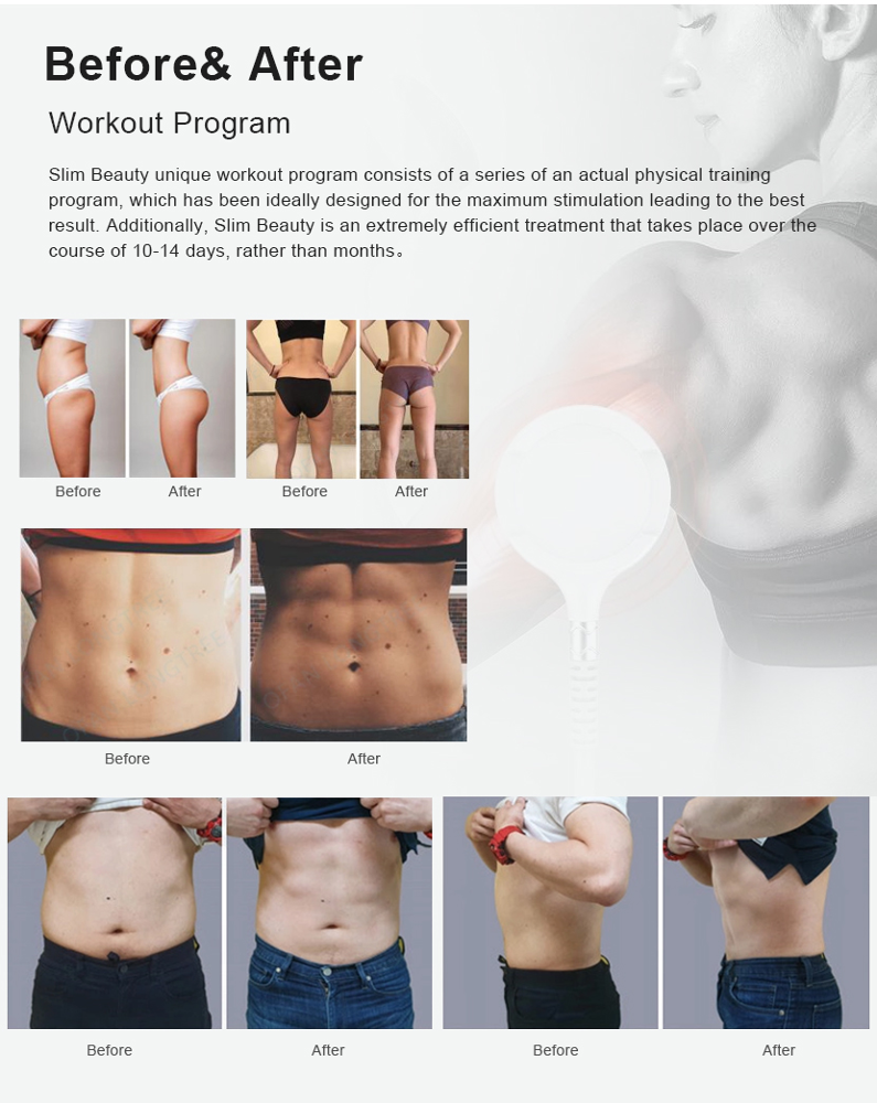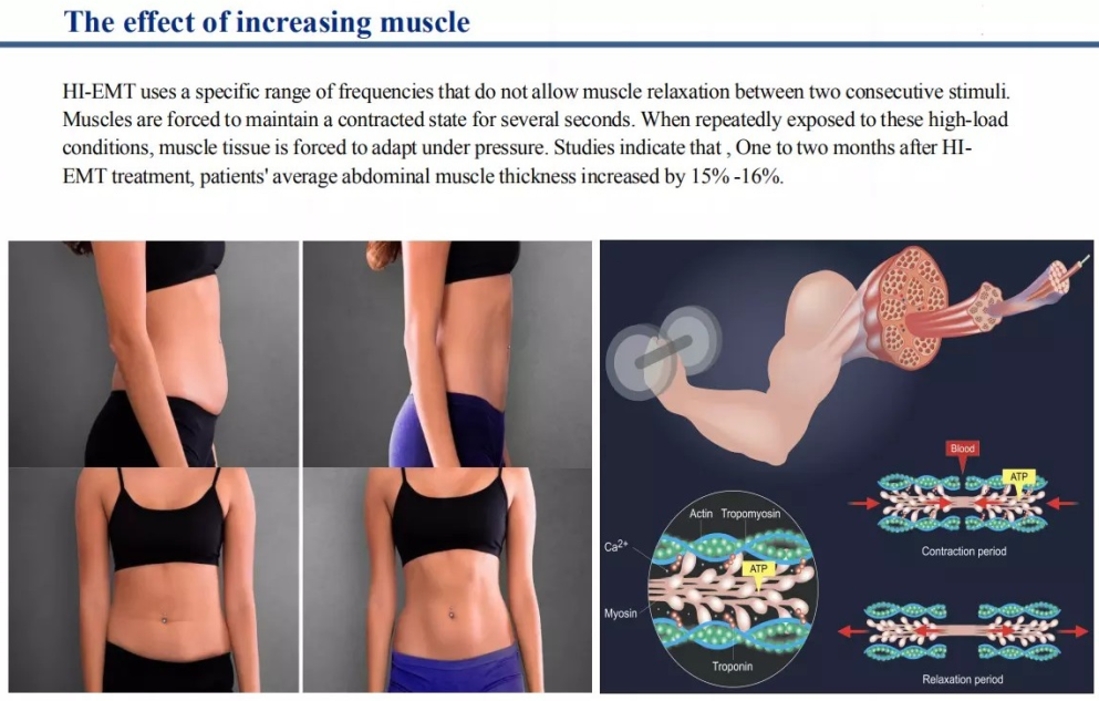 La ricerca medica mostra che, dopo un ciclo di trattamento, HI-EMT può aumentare efficacemente del 16% la massa muscolare e ridurre del 19% il grasso corporeo allo stesso tempo.