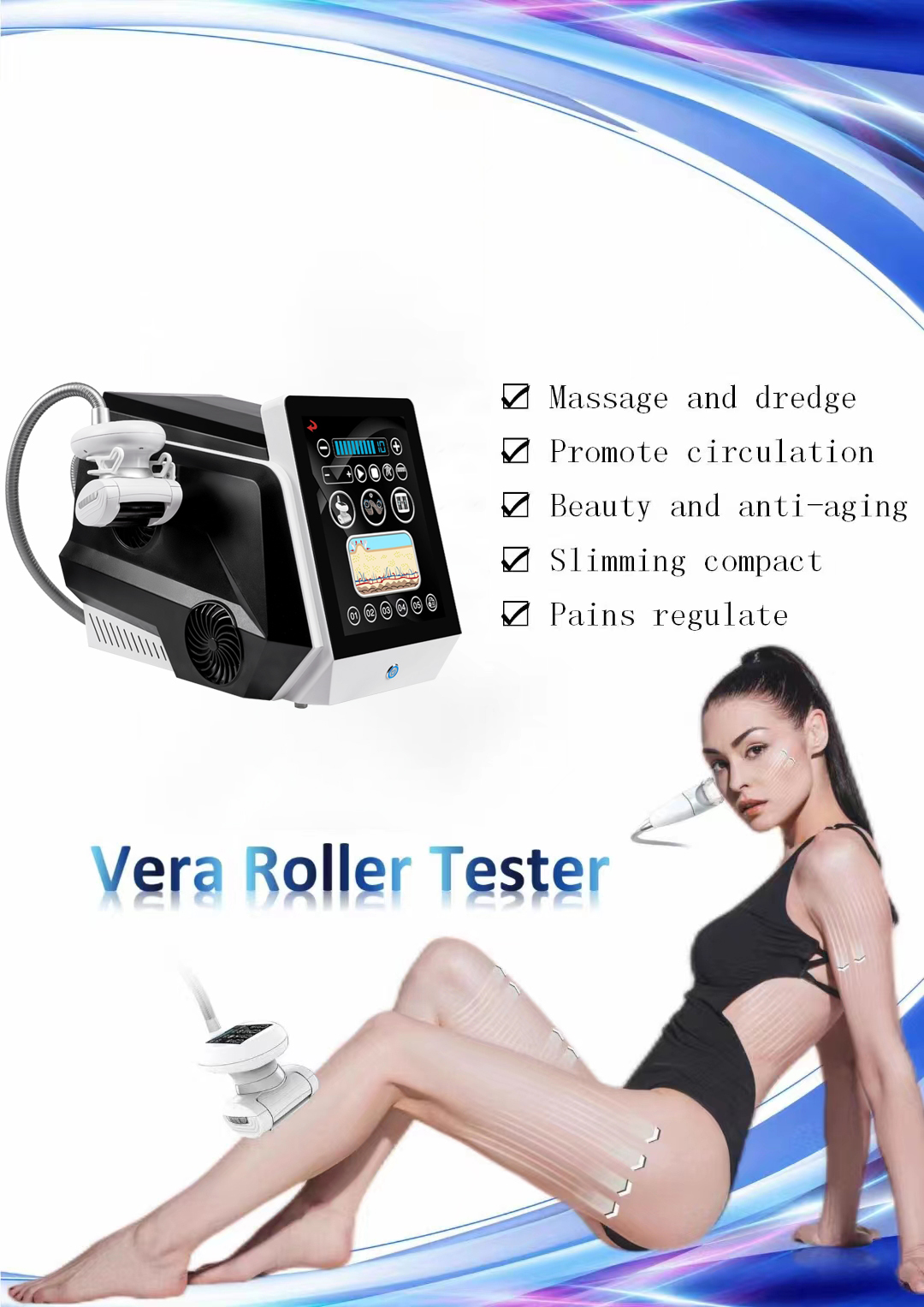 Il Vera Roller Tester adotta la tecnologia "Stimolazione Meccanica a Pressione Negativa Tridimensionale", che è una terapia di massaggio a vuoto non invasiva. Il principio consiste nell’utilizzo di rulli elettrici bidirezionali combinati con la pressione negativa del dispositivo di cura, e di un labbro elettrico combinato con la pressione negativa del dispositivo di cura, per effettuare massaggi meccanici di rotolamento, aspirazione, impastamento, pizzicamento, rimbalzo e altri esercizi aerobici meccanici. La stimolazione meccanica ripetuta può penetrare più profondamente nei tessuti connettivi e adiposi, nei tessuti sottocutanei, nei sistemi di circolazione linfatica e sanguigna, esercitando così un effetto stimolante e attivante sui tessuti della pelle. Questo provoca compressione e rughe nei tessuti della pelle, e l’effetto della pressione positiva e negativa produce una delicata stimolazione meccanica sui tessuti della pelle più profondi, inducendo reazioni biochimiche nelle aree trattate. Questo consente di attivare efficacemente la decomposizione degli adipociti sottocutanei e ridurre l’accumulo di grasso nei tessuti a nido d’ape, aumentando la circolazione del sangue e della linfa nei tessuti connettivi, eliminando i rifiuti metabolici, riducendo l’eccesso di acqua e tossine nel corpo, eliminando i tessuti a nido d’ape, alleviando il dolore muscolare e raggiungendo l’effetto di dimagrimento. Stimola inoltre l’attività dei fibroblasti, promuovendo la proliferazione di collagene, elastina e acido ialuronico, rendendo la pelle di tutto il corpo tonica, piena ed elastica, riducendo le rughe a buccia d’arancia e migliorando la distribuzione del grasso. Ripristina la salute e la vitalità del tessuto cutaneo, modellando un corpo più snello, scolpito e una pelle giovane. È l’esperto di "gestione sana del corpo". Il trattamento richiede di indossare collant speciali, in modo che il rullo possa offrire un massaggio profondo e uniforme al corpo.