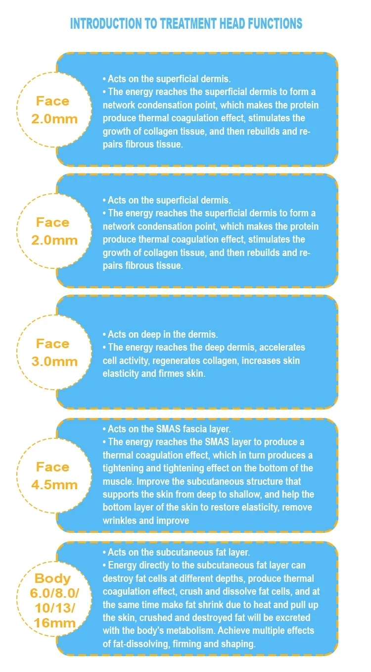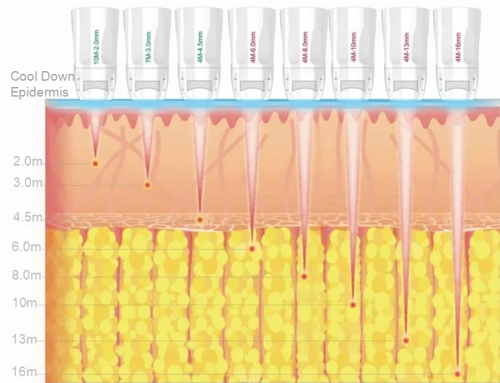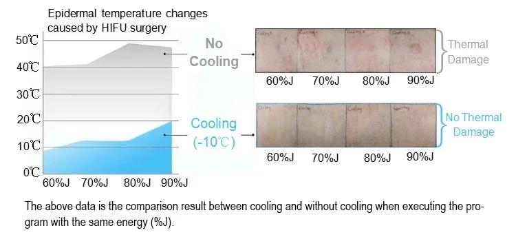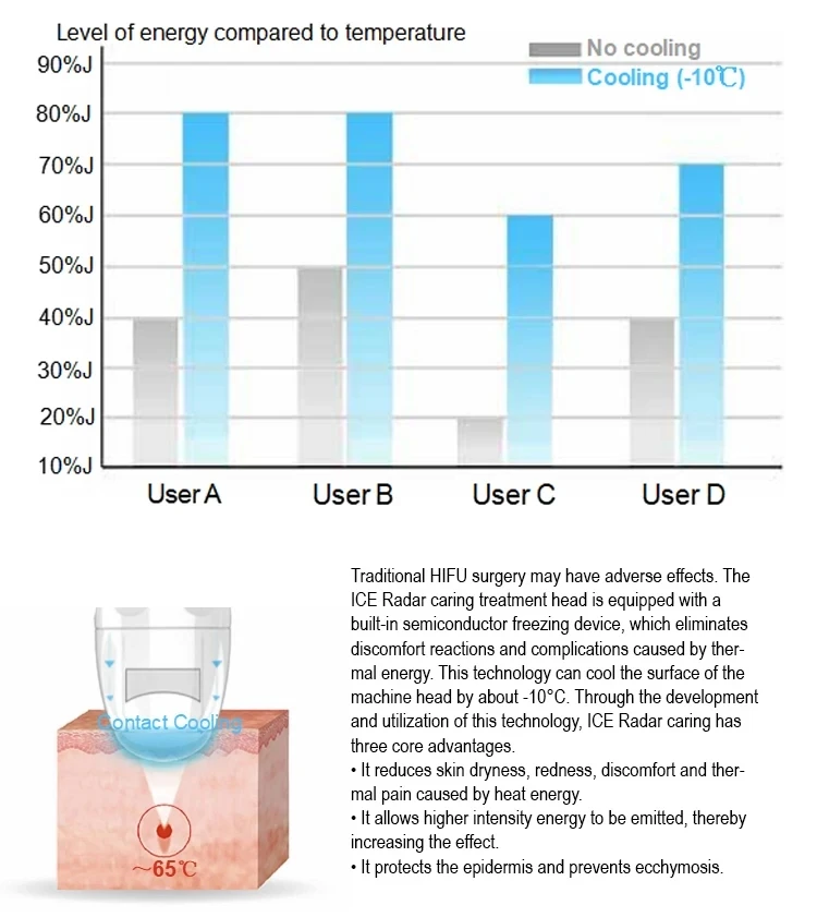 Riduce secchezza, arrossamenti, gonfiori e altri disagi spesso associati ai trattamenti HIFU tradizionali. L'effetto di raffreddamento protegge efficacemente la pelle, eliminando reazioni di disagio e complicazioni legate all'energia termica. -