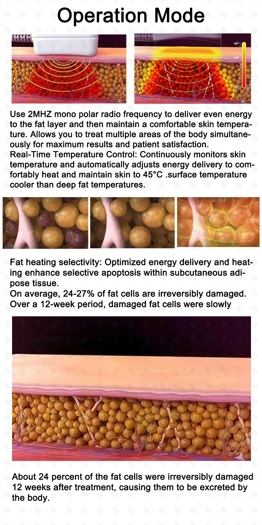 Attraverso dispositivi a radiofrequenza di diverse forme, il grasso e il derma vengono riscaldati a una temperatura di 43-45°C, generando calore continuo che brucia le cellule adipose, rendendole inattive e apoptotiche. Dopo un periodo di trattamento che varia da alcune settimane a diversi mesi, le cellule adipose apoptotiche vengono gradualmente metabolizzate ed espulse dal corpo.